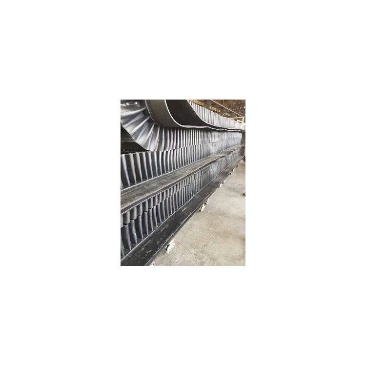 上覆盖胶厚度一般为3-6mm;下覆盖胶厚度一般为1.5-4.5mm,带芯材料承受拉力,其材料可以是棉帆布(CC)、尼龙帆布(NN)、聚酯帆布(EP)或刚绳芯(ST)。为了增加基带的横行刚性,在芯体上、上假如特殊加强层,称横向刚性层。基带的宽度规格,与普通胶带相同波形挡边输送带被广泛引用与港口、冶金、矿山、电力、煤炭、铸造、建材、粮食
