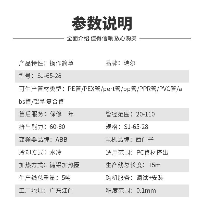 | 可生产管材类型: | PE管、PEX管、pert管、pp管、PPR管、PVC管、abs管、铝塑复合管 |