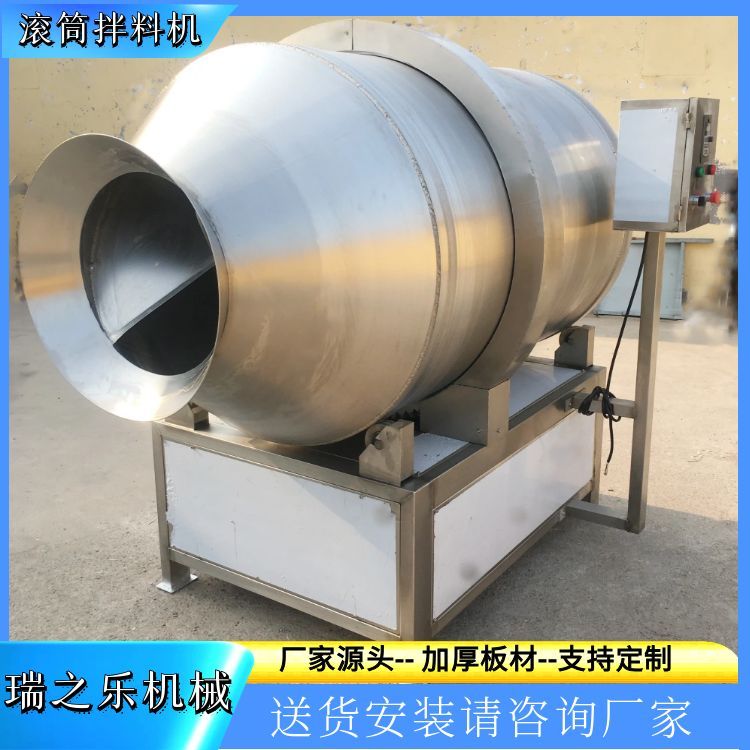 食品滚筒拌料机是一种专门用于食品加工调味料的混合搅拌设备,通过滚筒的旋转使物料均匀混合,入味快拌料均匀!