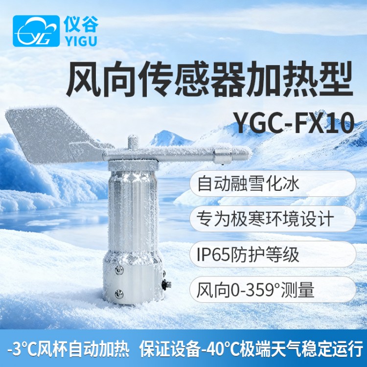 YGC-FX10加热型风向传感器,可测量实时风速,并直接将其转变为线性输出信号。风向叶片内置加热部件,采用特殊密封轴承,全金属材料机身经过特殊处理工艺具有高的防紫外线和防腐能力,对于如多尘、高湿、高盐雾、极寒、风暴或冰雹等极端天气的侵害有强大的防御能力,能够在极端气候条件下稳定运行。