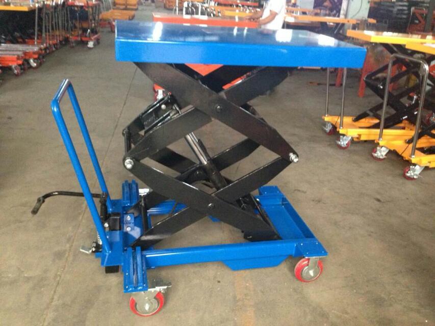 6、手动平台车又名手动液压平台车,平台下降控制为旋扭或扳手控制,踏动塌脚杆操纵油泵,使工作台面平稳上升。操纵控制旋钮或向上提升扳手,使工作台面平稳下降, 车架底部配有万向轮,可向任意方向旋转,操作灵活简便。