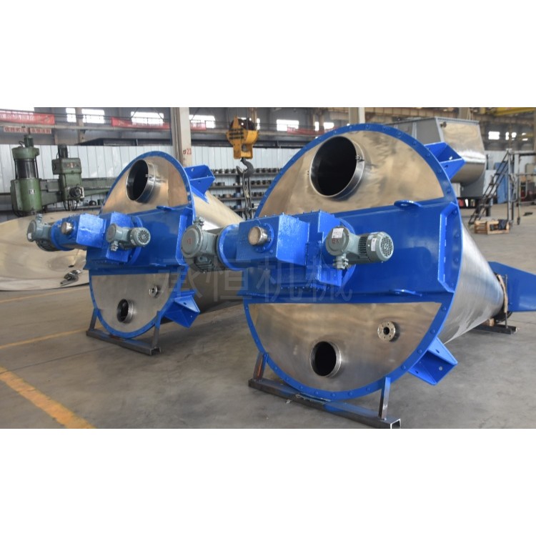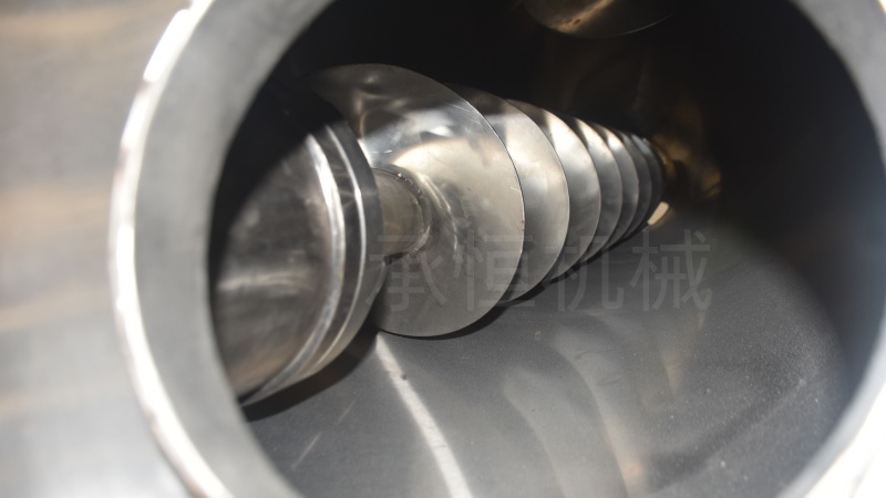 做轴心旋转,轴向由内至两侧推动,外螺条带动靠近桶壁物料做轴心旋转,轴向由两侧至内推动,于是造成物料在桶体内对流循环、剪切渗混,完成物料在较短时间内快速均匀混合。