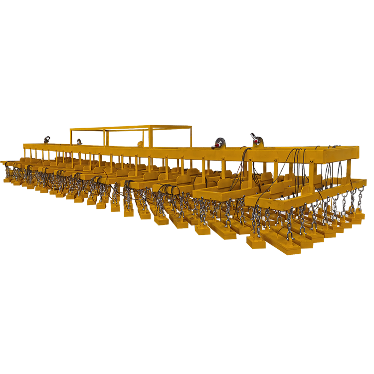 电永磁吊具多连吊,采用先进磁力技术,实现38件电永磁吸盘同步吊装,安全稳定,操作智能简便,节省人力,大幅提高生产效率与作业安全性。