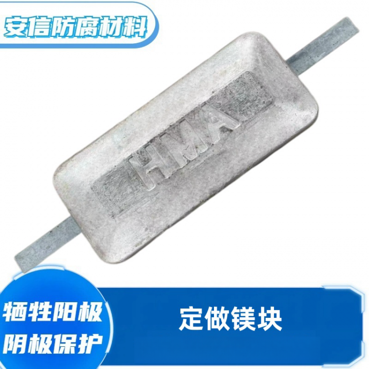 镁阳极有高驱动电压、低电流效率、造价高。根据形状以及电极电位(开路电位)的不同,镁阳极可用于电阻率在15欧姆·米到150欧姆·米的土壤或淡水环境。一般不应用于土壤电阻率小于10欧姆·米环境。高电位镁阳极的电位为-1.75V CSE,驱动电压0.85V;低电位镁阳极的电位为-1.55V CSE,驱动电压0.7V。使用温度可以达到100℃。当牺牲阳极剩余量为最初重量的15%,即认为阳极失效,所以,阳极的使用率一般取85%。