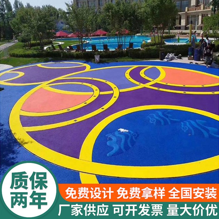 彩色EPDM与高强度胶粘剂结合的弹性体, 适合于各类幼儿园或健身路径。色彩鲜艳、 平整度高、图形丰富、粘接力强、环保无味.