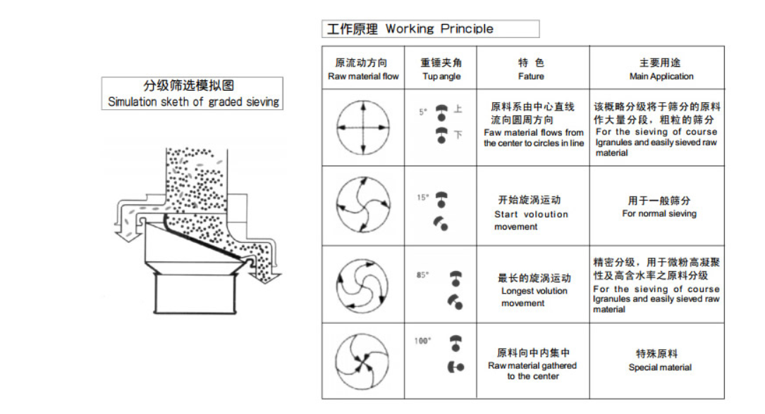 本机适用于制药、化工、食品等行业的粉末及粗小颗粒比例不等的分级,且能连续过筛出料。