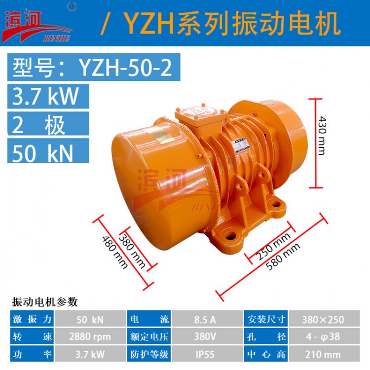 滨河YZH-50-2是2极卧式三相异步振动电机,以3.7kW功率输出0-50kN可调激振力,转速2880rpm,适配振动给料、输送、筛分等设备,具备密封强、激振力可调、维护便捷等优势。以下为核心信息: