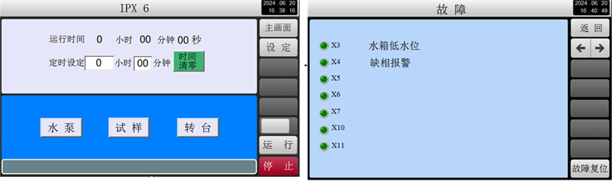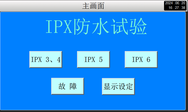 本淋雨试验机为组合式,从IPX3~X6淋雨测试等级组合为一体控制。节约了客户试验室空间,每小时运行可节约用水量6个立方。IPX56喷射是从箱体后方喷出。控制方式可编程控制系统,由触摸屏设定界面设置IPX34、X56独立控制。可设定摆管320°旋转角度适应IPX4测试等级,及设定喷淋时间,独立样品转盘控制。符合标准:GB/T2423.38-2005<电工电子基本环境试验规程>;GB4208<外壳防护等级〉