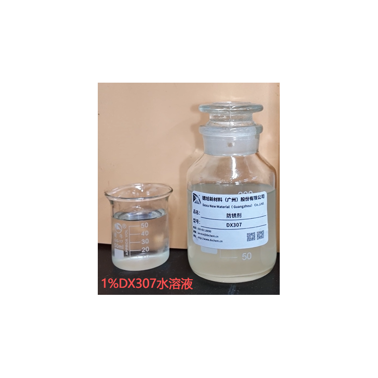 防锈剂DX307是一种多元羧酸胺盐,不含硼、磷、硫、氯等元素,具有优异的防锈性、抗硬水、耐强碱、无泡、低残留和能与水以任意比例互溶的性能特点,广泛应用于成型铁拉丝、CNC加工、金属防腐蚀、表面处理等行业。