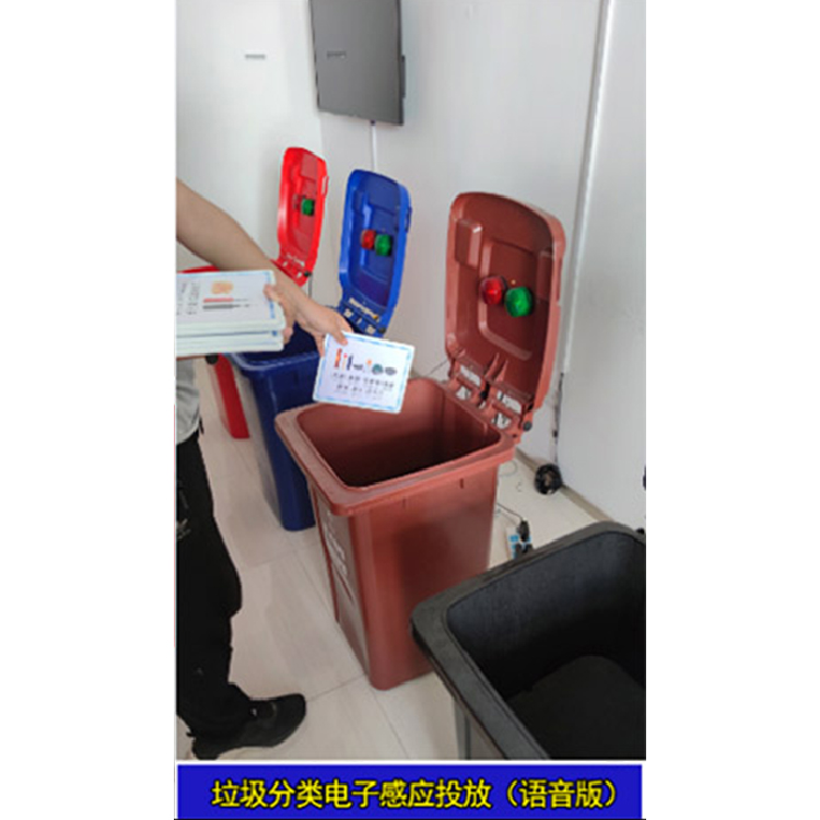 本产品使用市面通用的100L垃圾桶进行电子改装,带有100个贴有不同垃圾名称和图片的物品感应画板,约有300至400种常见垃圾物品名称和图片,涵盖日常生活中垃圾种类,具有较高代表性和实用性。体验时,体验者将画板投入桶中,此时内衬下层的识别电路就会感应并判断出对错,指示灯亮起,并同时播放语音,特别适合于科普馆、社区体验室、学校体验室的垃圾分类培训机构等。