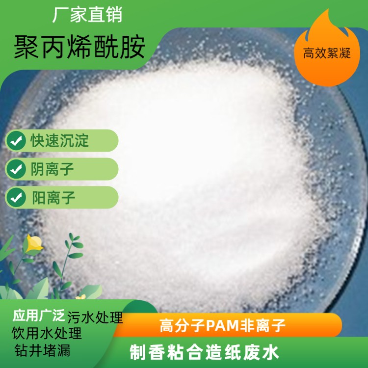 非离子(NPAM)聚丙烯酰胺用途:澄清净化作用、沉降促进作用、增稠作用及其它作用、过滤促进作用。在废液处理、污泥浓缩脱水、选矿、洗煤、造纸等方面,能够充分满足各种领域的要求。同时使用非离子聚丙烯酰胺和无机絮凝剂(聚合硫酸铁,聚合 氯 化 铝,铁盐等),可显示出更大的效果。