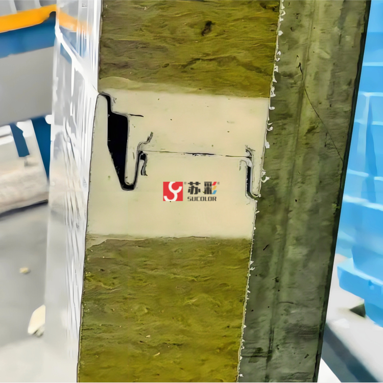 苏彩防腐聚氨酯封边复合板又称金属面防火板主要是以岩棉和玻璃丝棉为主是采用苏彩防腐钢塑板为正反面材料,连续棉纤岩棉、玻璃棉为芯材,高密度硬质发泡聚氨酯为企口填充,经过高压发泡固化、自动密实布棉并由超长精密双履带控制成型后复合而成。