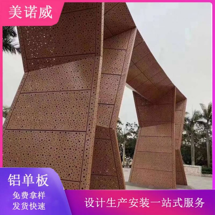 廊架铝单板铝板幕墙安装施工方便快捷。铝板在工厂成型,施工现场不需裁切只需简单固定。 天津美诺威弧形景观亭廊架铝单板厂家