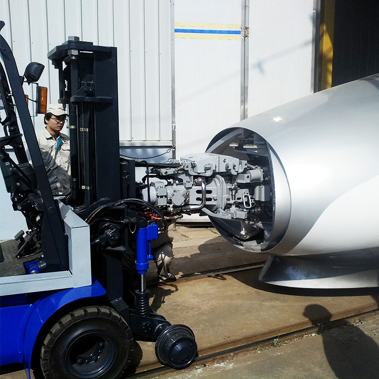 受四方机车厂委托,我公司与哈尔滨工业大学合作开发生产的公铁两用高铁自动检测车解决了机车检测效率低下的问题。该车使用1.5吨电动叉车底盘,增加液压系统和导向系统(导向钢轮等)后变为公铁两用车,然后在前边安装和高铁匹配的高铁车钩,后边加装用于自动进行电气检测的电气系统和气路系统。检测时,先将车开到钢轨上,导向轮对准钢轨,操作手柄,降下导向轮,检测车就可在钢轨上行走,与高铁撞上钩,便开始自动检测高铁的电气系统,每一项按程序都检测完毕便自动结束。