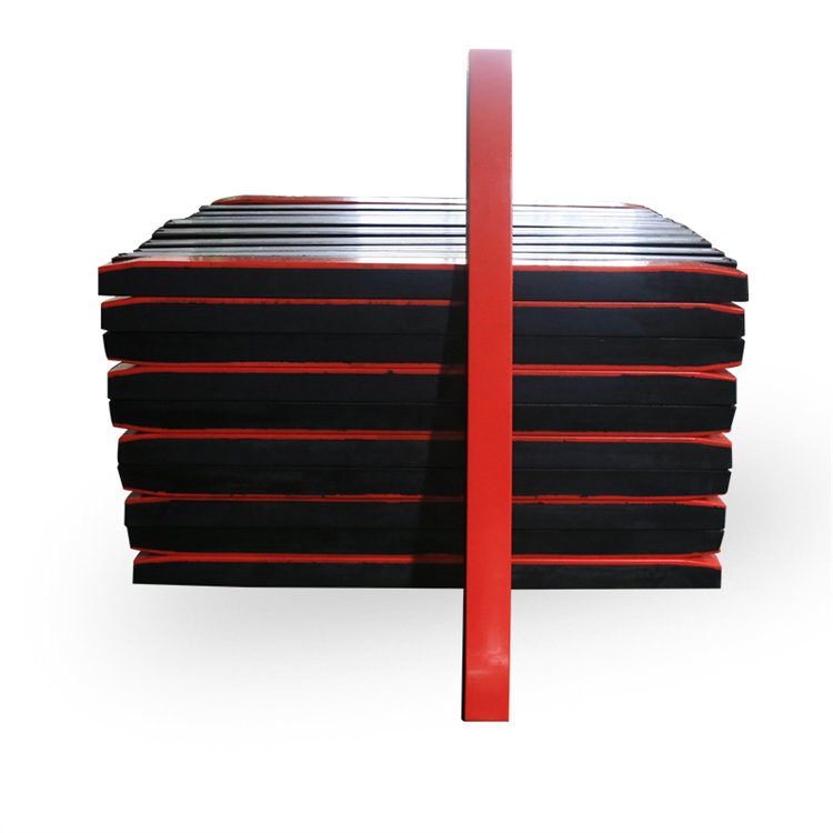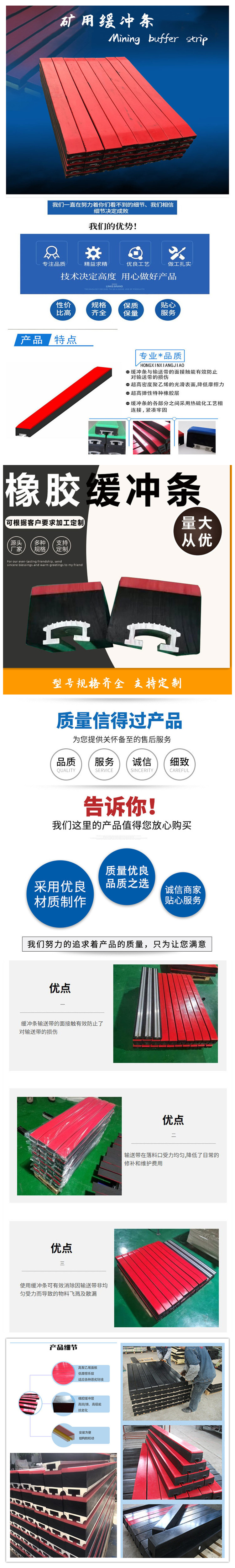 缓冲胶条由骨架和橡胶热硫化而成,骨架一般有C型钢和铝合金两种材质,骨架主要是用来连接缓冲床的支架的,我们配以防松型螺栓,可保证缓冲条牢牢的固定在缓冲支座上,可长期承受冲击而不松动。好的缓冲胶条设计要合理,与皮带的带宽,带速,落料点的高度,介质的密度等参数相吻合,品质好的缓冲条的用料也是非常关键的,橡胶层的天然橡胶含量高,弹性就好,吸收冲击能力就比较强,品质差的缓冲条的橡胶层天然橡胶含量低甚至没有天然橡胶,弹性非常差,这样的缓冲条对使用厂矿来说,作用是非常小的。山东美奂橡塑