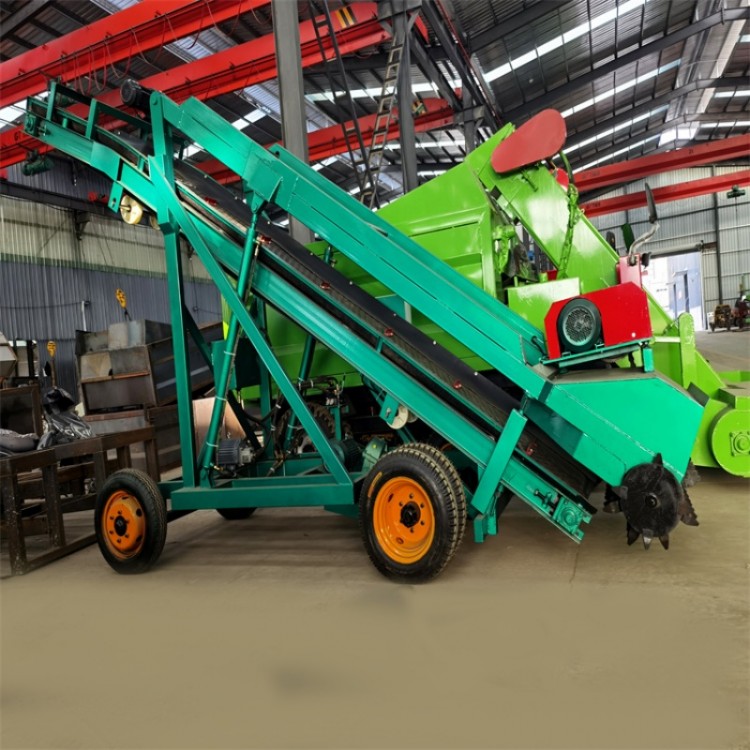 青贮取料机,包括机架,斜梁,从动辊,主动辊,取料杆,调节油缸,输送带,其特征在于:机架底端两侧分别设置有行走轮,机架中部设置有斜梁,斜梁左端底部设置有从动辊,斜梁右端上部设置有调节油缸,调剂油缸右端设置有推杆,推杆右端设置有主动辊,推杆下端右部设置有导料板,主动辊与从动辊之间设置有输送带,斜梁中部底端设置有若干弹簧,弹簧底端设置有调节辊,调节辊与输送带形成配合,机架上部设置有可转动的取料杆,取料杆与斜梁之间设置有推举油缸,取料杆左端设置有取料辊轮,取料辊轮通过皮带与取料电机相连接,取料辊轮上设置有若干取料刀,取料杆左部上端设置有辅助电机,辅助电机左侧中部设置有转轴,转轴上设置有螺旋桨叶。