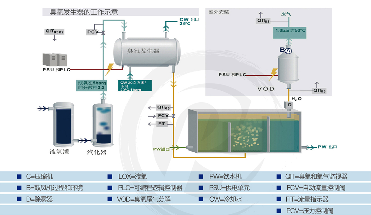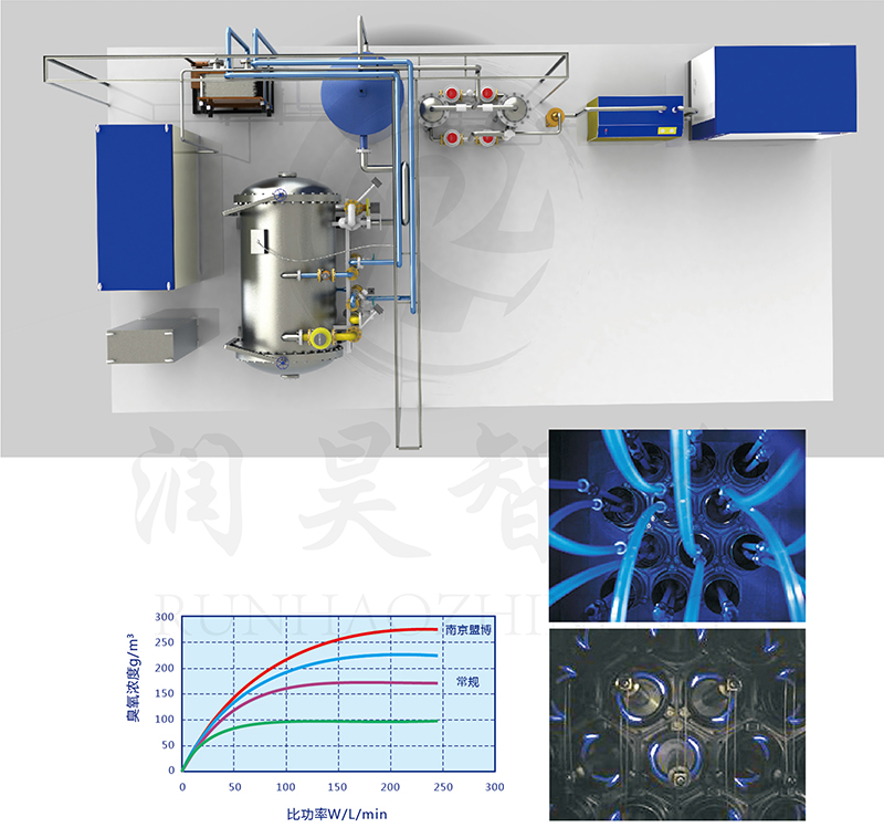 大型臭氧应用化处理系统是由气源供应系统、气源处理系统、气源质量检测系统、气源压力调节、流量控制分配系统;臭氧电极、臭氧电源、臭氧变压器臭氧放电室、臭氧冷却系统、臭氧质量检测控制系统、臭氧智能控制柜;和臭氧气体分配、臭氧智能投加以及臭氧尾气处理等组成完整的臭氧应用化处理系统。