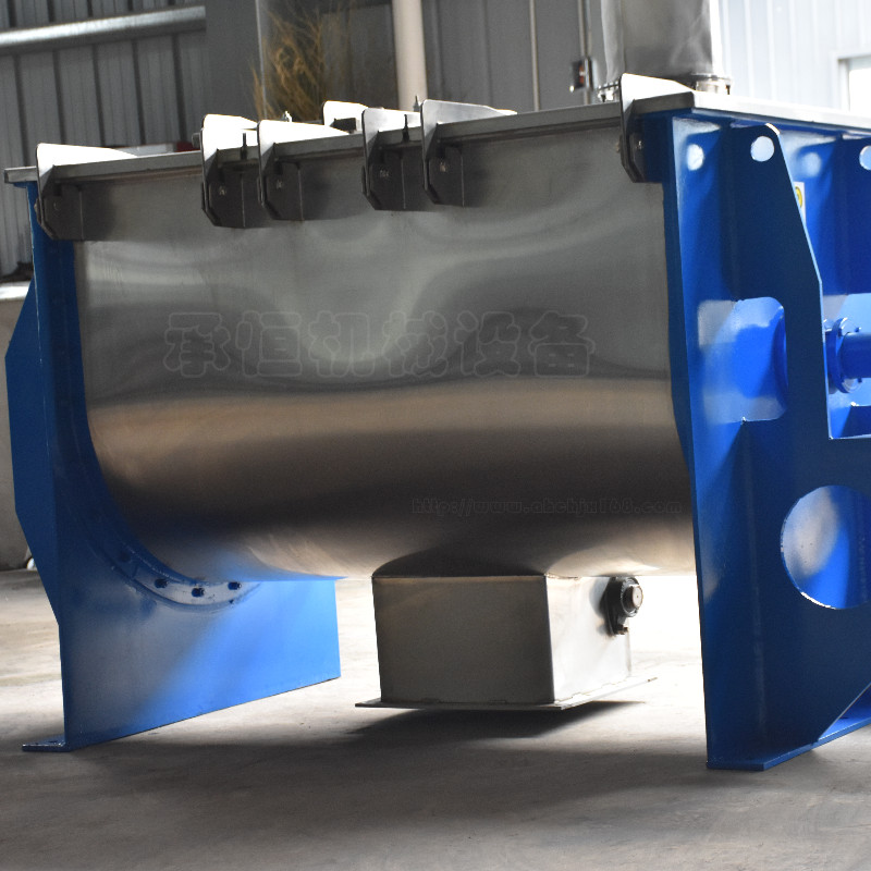 卧式螺带混合机的传动主轴上布置双层螺旋叶片,内部螺旋将物料向外侧输送,外部螺旋将物料向内部聚集。物料在双层螺旋带的对流运动下,形成一个低动力混合环境,安装于搅拌轴上的内外径螺旋带动桶体内物料,使搅拌器在桶体内大范围翻动物料。搅拌装置工作时内螺旋带动靠近轴心处物料做轴心旋转,轴向由内至两侧推动,外螺旋带动靠近桶壁物料做轴心旋转,轴向由两侧至内推动,使混合物料能够在较短时间内均匀混合。