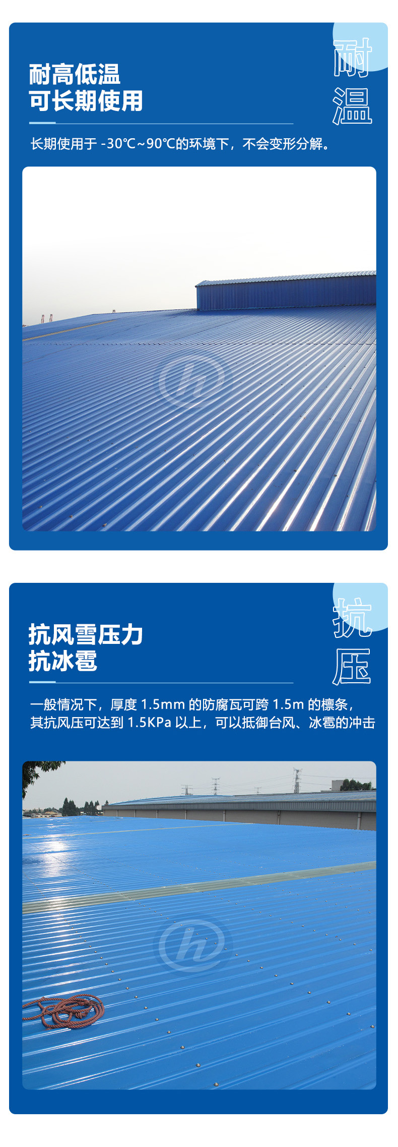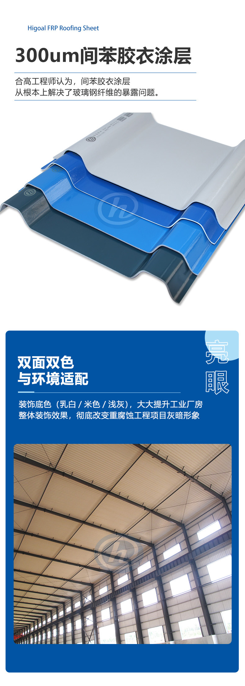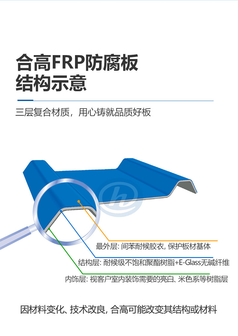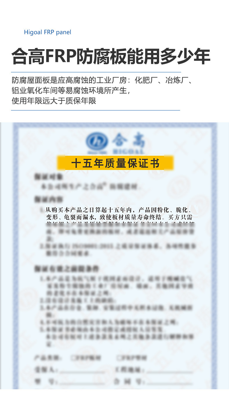 合高从1996年开始生产FRP屋面板,30多年来,合高FRP板材遍及全国25个省市,超过10万间工业建筑正在使用合高FRP板,目前没有因老化产生屋面漏水的记录。