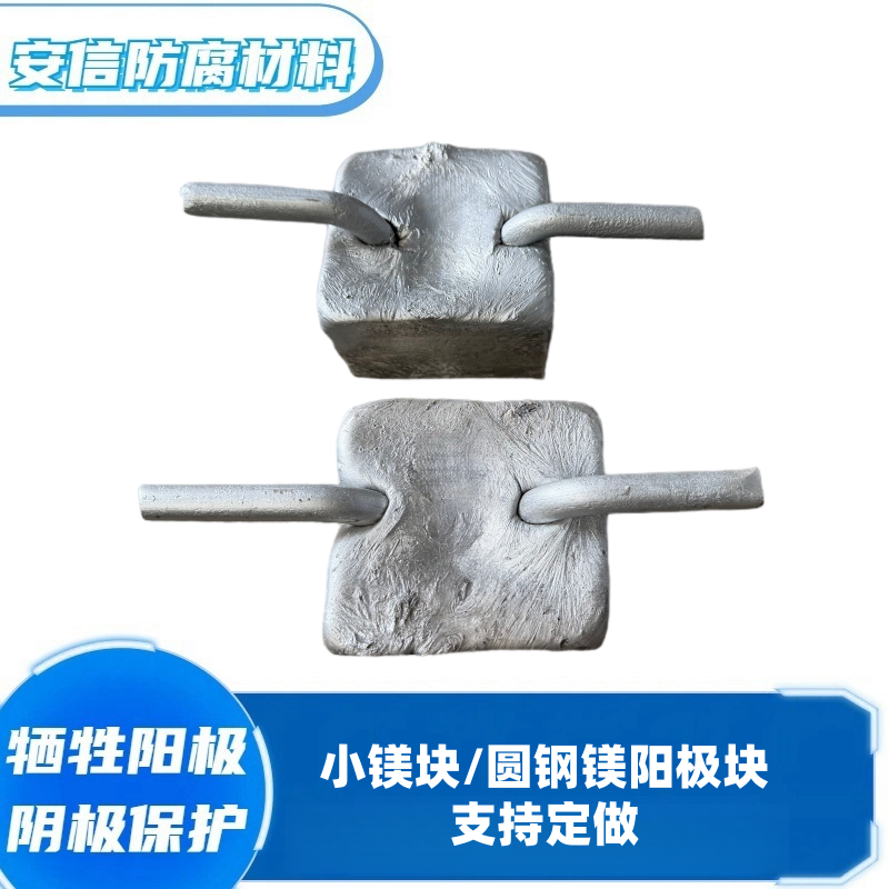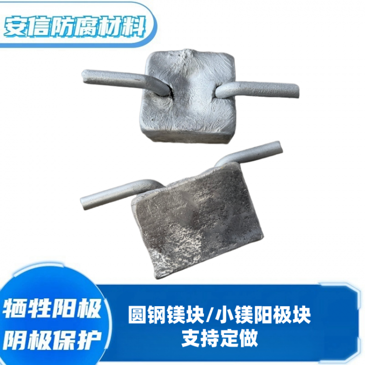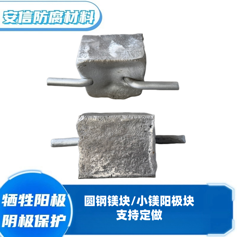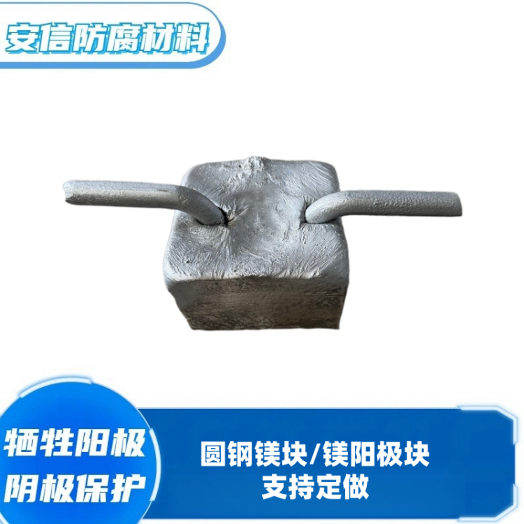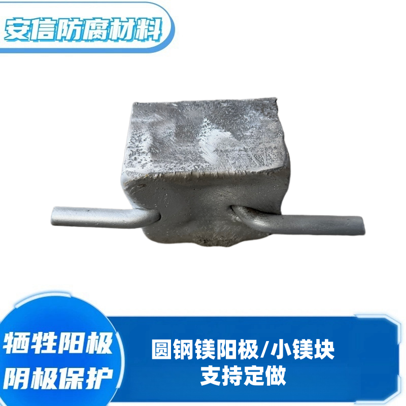 镁阳极有高驱动电压、低电流效率、造价高。根据形状以及电极电位(开路电位)的不同,镁阳极可用于电阻率在15欧姆·米到150欧姆·米的土壤或淡水环境。一般不应用于土壤电阻率小于10欧姆·米环境。高电位镁阳极的电位为-1.75V CSE,驱动电压0.85V;低电位镁阳极的电位为-1.55V CSE,驱动电压0.7V。使用温度可以达到100℃。当牺牲阳极剩余量为最初重量的15%,即认为阳极失效,所以,阳极的使用率一般取85%。