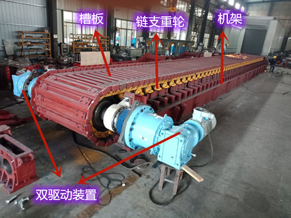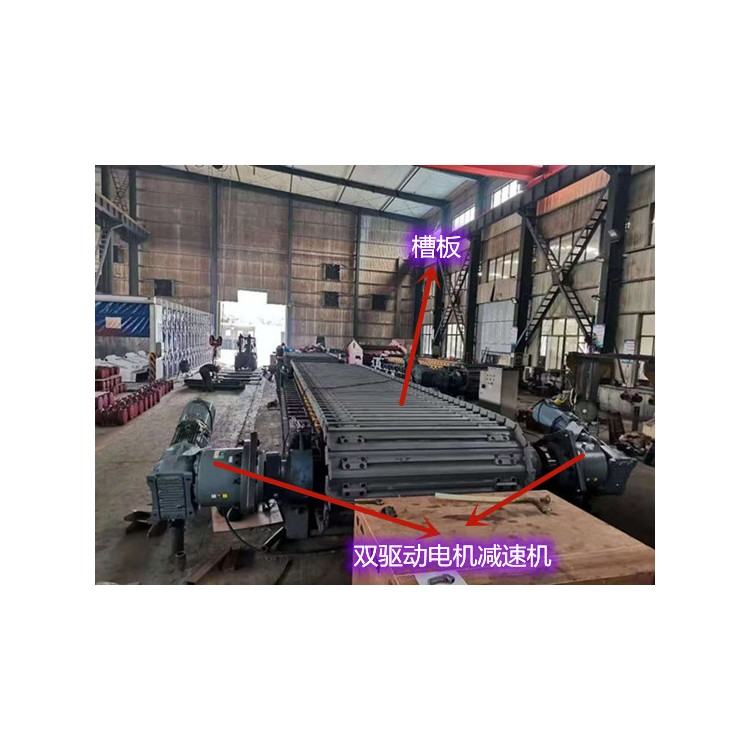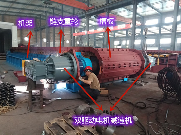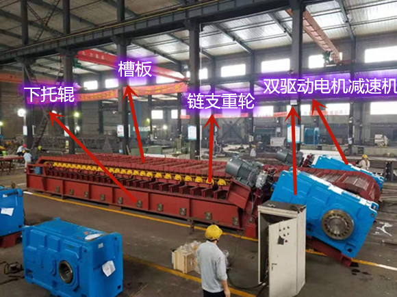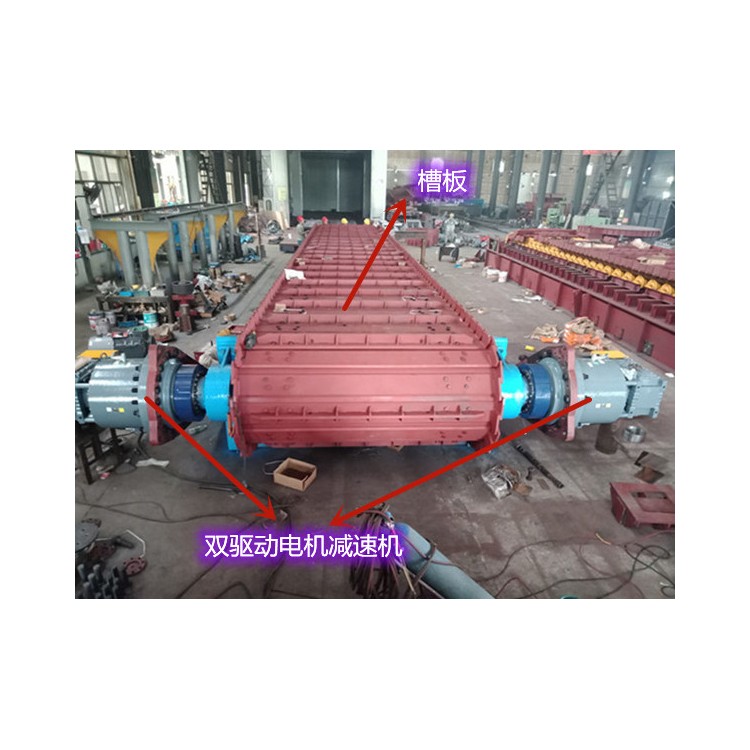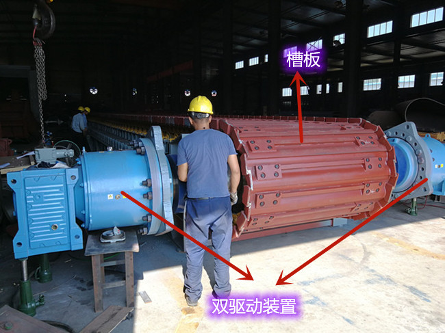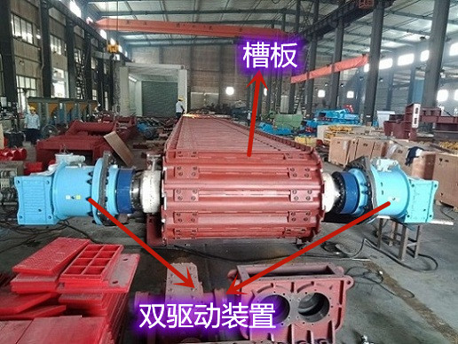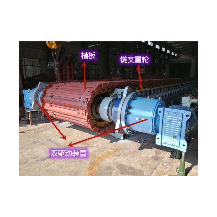 总结:这种双驱动装置结构通过两台电机协同工作,提高了板式给料机的驱动能力和运行稳定性,适用于大载荷、长距离输送的工况。