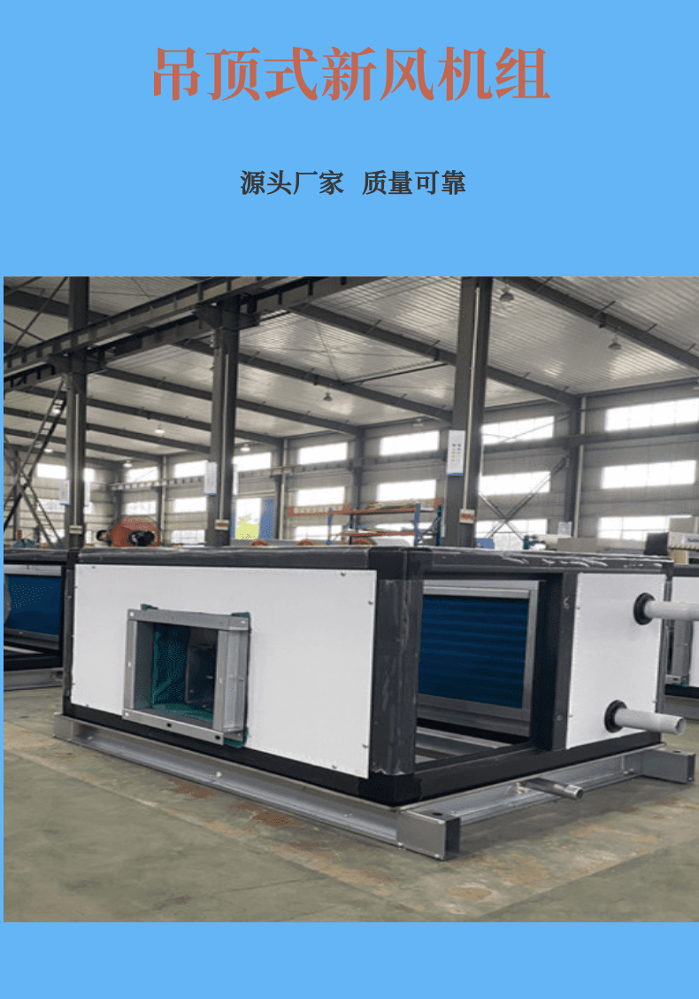 此外,吊顶式新风机组采用模块化设计,支持多台机组组合使用,进一步扩展了送风面积的覆盖范围。这种设计使得机组能够灵活适应不同规模和布局的空间需求,无论是大型公共建筑还是小型私人场所,都能找到合适的解决方案。
