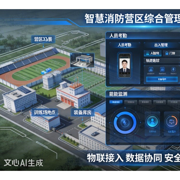 营区安防模块集成视频监控(营区全域高清视频监控,支持AI智能识别异常行为)、电子围栏(营区周界部署电子围栏,越界自动告警)、人脸门禁(人员人脸识别进出营区、办公楼、宿舍等场所)、巡更管理(制定巡更路线与计划,记录巡更人员、时间、地点,支持异常情况上报);人员管理模块包含考勤打卡(人脸识别、指纹打卡,支持请假、出差、加班申请与审批)、出入登记(外部访客线上预约、现场登记、凭证出入)、轨迹追踪(通过定位技术实时掌握营区内部人员位置与活动轨迹)、绩效考核(结合训练成绩、日常表现、任务完成情况等多维度进行绩效考核);装备管理模块支持智能仓储(装备分区存放,扫码入库、出库,实时监控库存状态)、装备台账(记录装备型号、数量、购置日期、维护记录、有效期等)、维护保养(制定维护保养计划,自动提醒保养周期,记录保养过程)、快速申领(消防员线上申领装备,审批通过后凭授权领用);训练管理模块包含训练计划(根据队伍训练需求制定年度、季度、月度训练计划)、场地预约(线上预约训练场地、器材,避免冲突)、成绩统计(自动记录训练成绩,生成个人、班组排名)、安全监测(训练过程中实时监测消防员身体状态与训练环境安全);后勤保障模块涵盖智能餐饮(食谱发布、线上订餐、就餐统计、食材溯源)、能耗监测(实时采集水、电、气等能耗数据,分析能耗趋势)、物业维修(线上提交维修申请,跟踪维修进度)、宿舍管理(宿舍分配、入住登记、退宿管理、宿舍设施维护)。