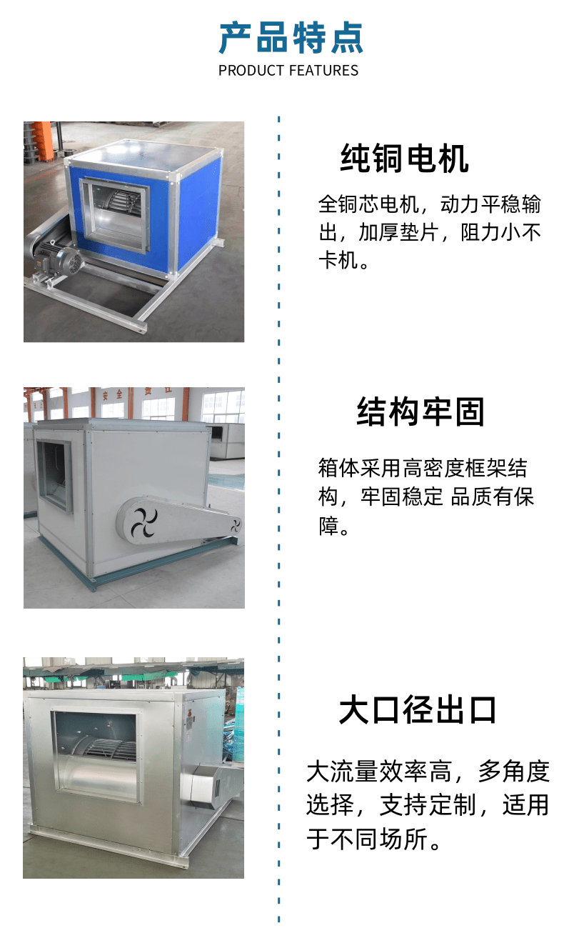离心消防排烟风机箱中的风机是核心部件,通常采用离心式风机,具有高效排烟、耐高温、低噪音、结构紧凑等特点,广泛应用于商业建筑、工业厂房、住宅建筑等场所的消防排烟系统。以下是其关键特性与应用场景的详细介绍: