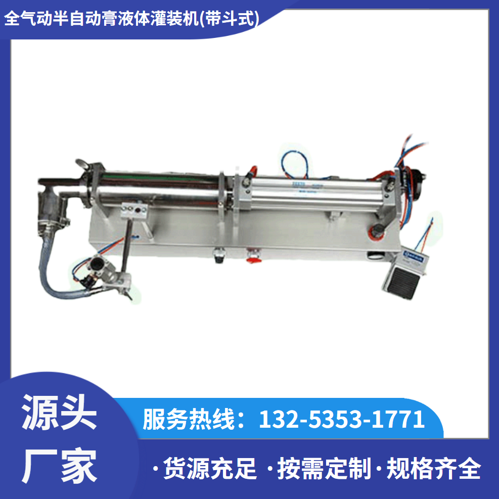 产品名称:全气动半自动膏液体灌装机(带斗式)