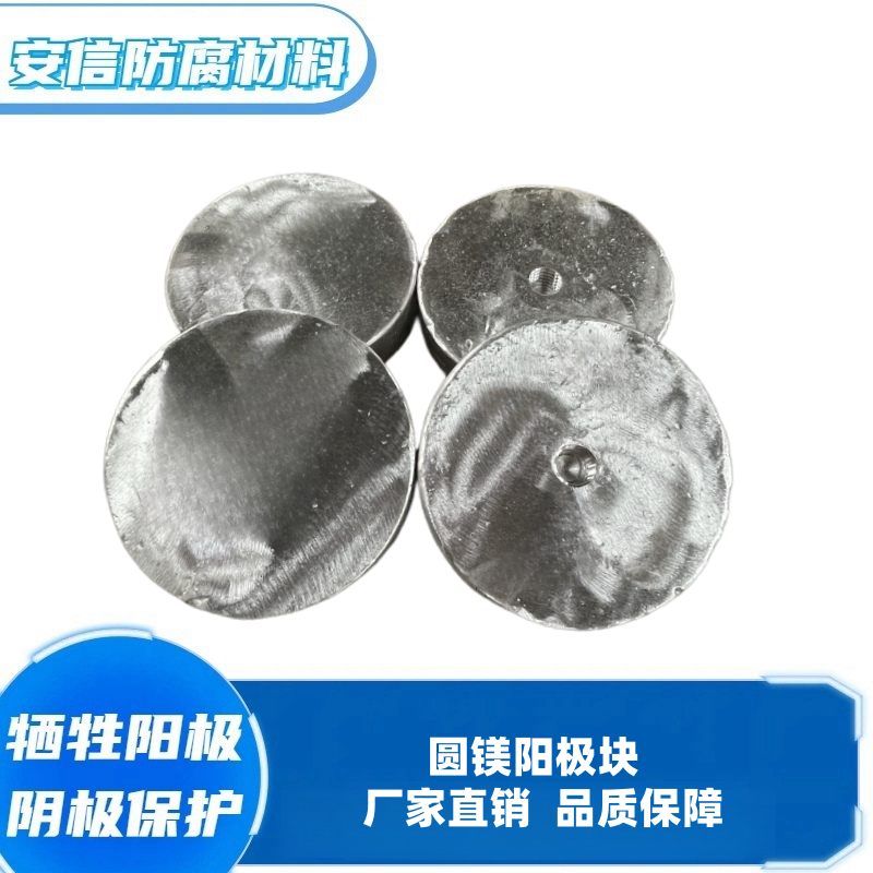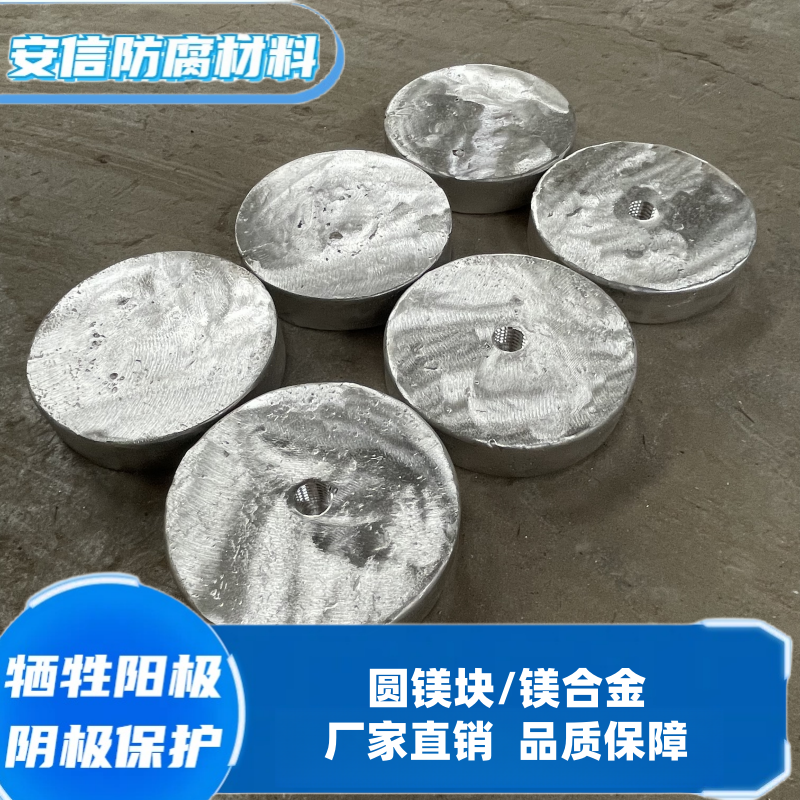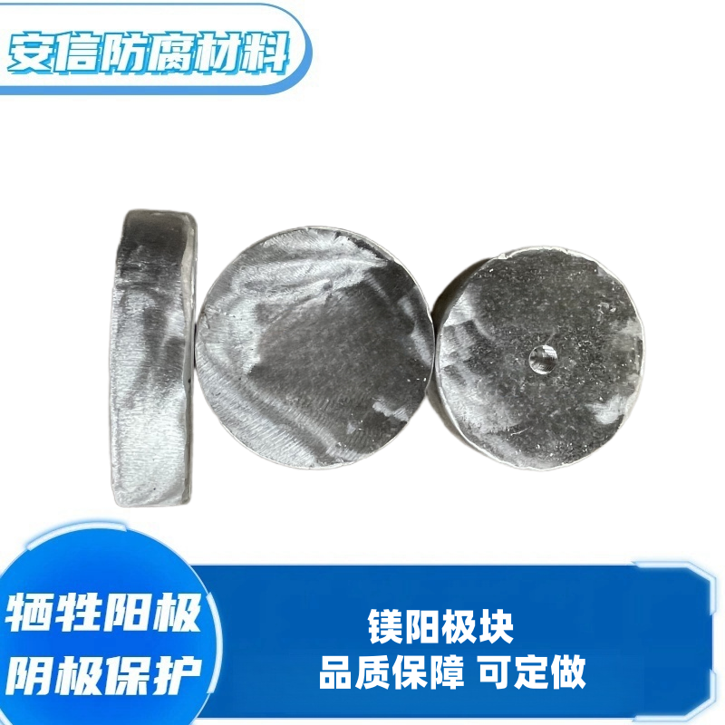 镁合金牺牲阳极用于阴极保护系统,是防止电化学腐蚀的重要设备与材料,因为镁合金阳极的电位比较高,经常用于埋地构筑物的阴极保护,例如埋地石油输油管道、输气管线等。镁牺牲阳极根据开路申位的高低又分为高电位和低电位镁阳极两种,生产工艺可分为铸造阳极和挤压阳极,为了适应各种环境,针对不同的保护对象,镁阳极可以做成各种各样的形状,在土壤及水中常用的D型和梯形截面的铸造阳极。在热交换器中多用挤压的圆柱形阳极,在高电阻率土壤中或套管内多用带状高电位镁阳极,在水下常用半球行阳极,在低电阻率环境中复合阳极时理想的阳极。