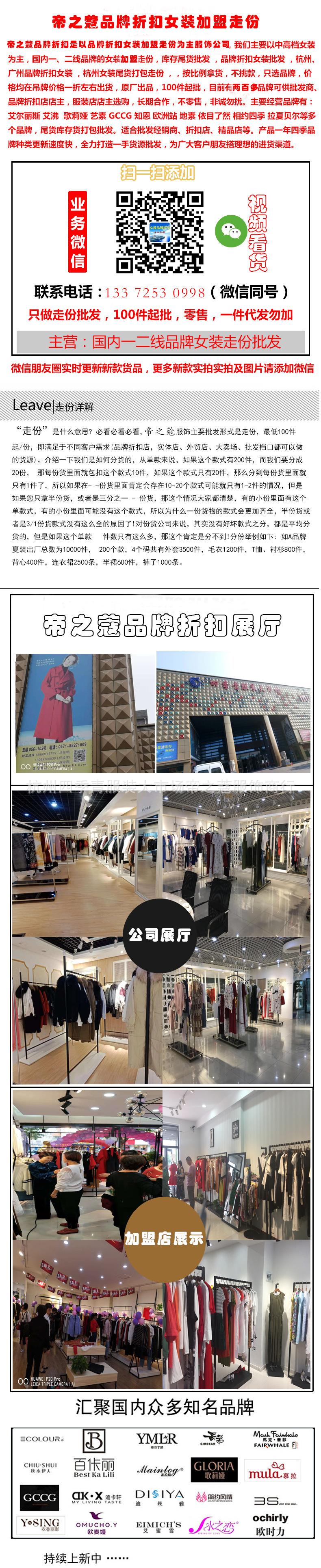我知道大家找货源辛苦不容易,现在也到了我们品牌折扣出货的旺季,有时忙的没有时间回复大家的咨询,阿里巴巴更是没有时间及时去更新,很多新到的好货都会在微信朋友圈第一时间发图,为避免大家不要错过商机,如果您是开服装店的,互相加个微信,以便及时了解我司产品更新,每天发布最新品牌动态!