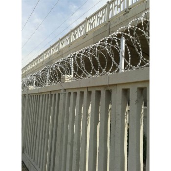 刀刺滚笼网公司,刀刺滚笼网公司价格,刀刺滚笼网公司价格纵向拉筋采用热镀锌刺丝,张开后每交叉圈安装间距20cm,直径不小于45cm。支架设置在跨度3m防护栅栏的立柱和跨中位置,刺丝滚笼由刺丝连接卡扣与固定在支架上的纵向拉筋相连接,刺丝滚笼的下缘距离钢筋混凝土防护栅栏上缘的垂直距离为0.05m。矩形钢管上部焊接挂钩采用长度30mm丝径5mm冷拔钢筋制作,刀片刺绳大概分为螺旋型、直线型、螺旋交叉型三种方式。