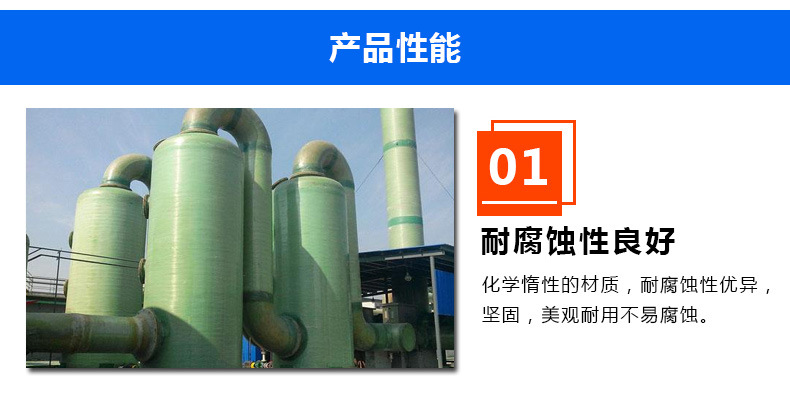 其主体采用改性耐高温性能树脂基复合材料。 对净化烟气的容量没有限制,且允许烟气量的变化范围较宽,对煤种和含硫量的变化范围适应性较强。脱硫塔使用寿命长,工艺保证脱硫后排放烟气温度在露点以上,对烟道、烟囱无腐蚀,脱硫塔生产的石膏晶粒很大,成分稳定,不含亚硫酸钙,很容易进行脱水,脱硫副产物无害化。