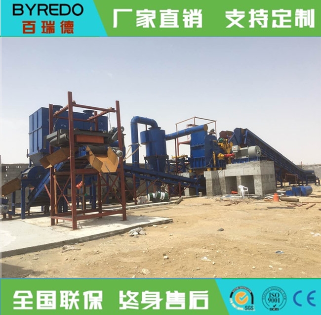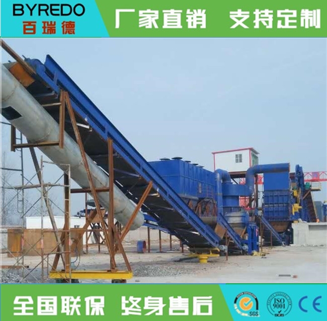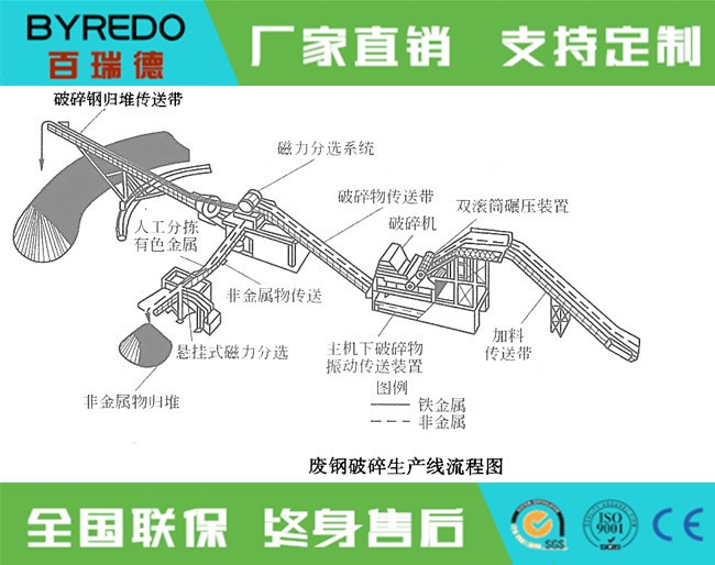 全套的汽车破碎机生产线由进料输送机、破碎机主机、出料输送机、磁选输送机、分料输送机、除尘、操作柜组成。从金属破碎机出来的破碎物,经过皮带输送机、磁力分选系统,把铁金属物和有色金属物和非金属物分离开,并由各自输送机送出归堆。有色金属和非金属物在输送机上会再次受到磁选设备的搜索,把游离铁金属物拣出,从而提高铁金属物的回收率,同时通过人工挑选有色金属,可提高回收效益。