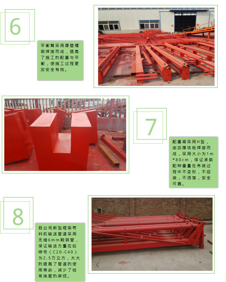 二.移动式混凝土布料机“Z”形三节折叠臂, 360°回转,能俯仰和展折变幅,在臂架长度范围内实现三维立体空间的全方位浇注,无浇注死角,能方便地实现墙体、管、柱、桩等各种施工作业的混凝土浇注;