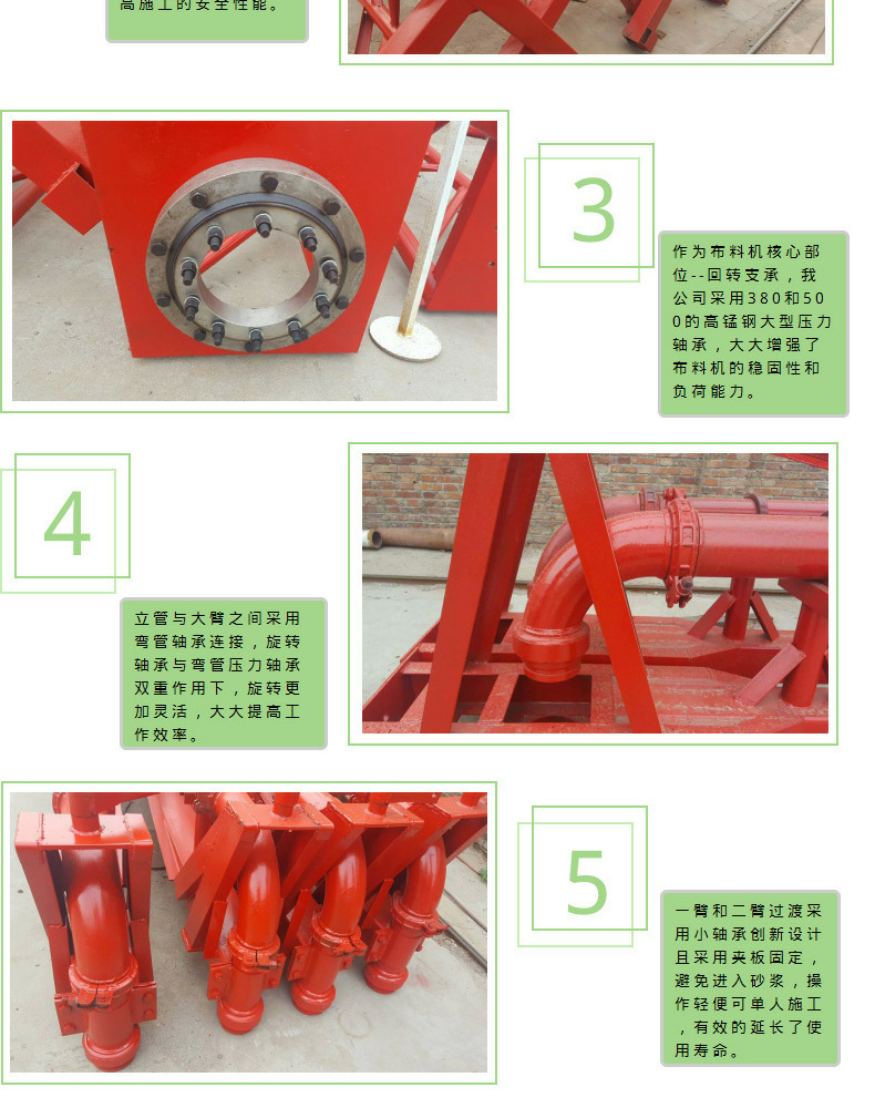 分类:液压布料机,手动布料机(又分12米 ,15米,18米三种) 由两部分回转架组成的合成运动就能复盖所有布料半径范围的布料点。