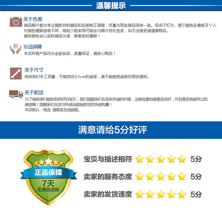 3.所有产品没有特殊说明都按照我公司产品标准生产。收到货不能以没你想象的好等理由来申请退款,可以通过协商来解决。