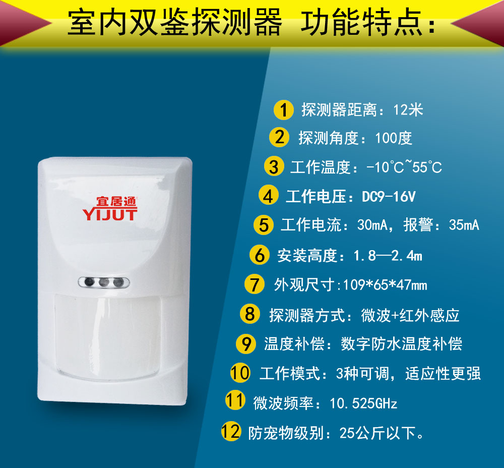 SS-40B为宜居通室内双鉴壁挂红外探测器之一,该双鉴红外探测器采用微波+红外双鉴探测器智能分析功能