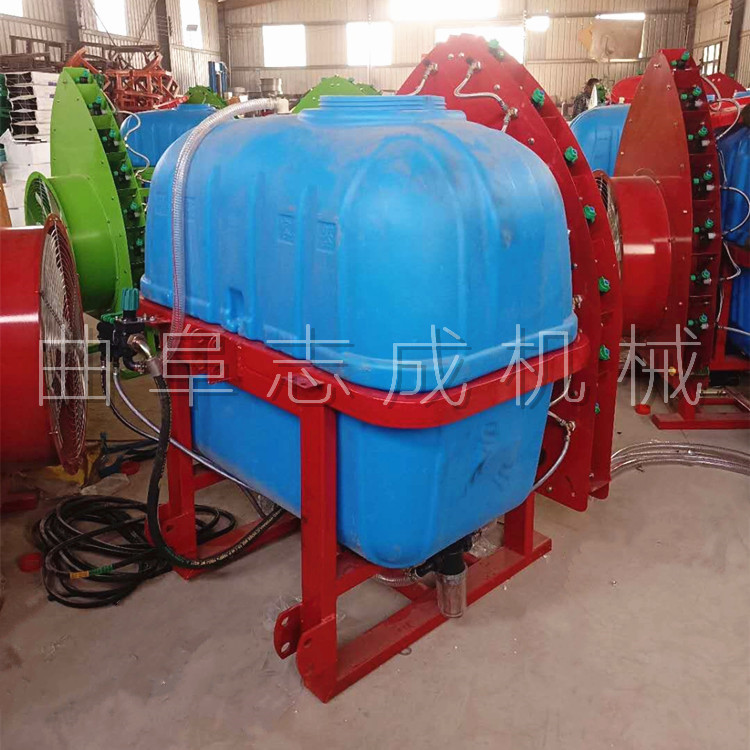 风送弥雾打药机匹配于拖拉机使用,与拖拉机后悬挂连接,传动轴带动喷雾泵和送雾风机工作。悬挂方式简单操作业使用操作性能高、通过性大大加强,简洁的机械传动,一人驾驶员即可轻松简单独立操作使用。在机器行进或停止中通过旋转的传动轴在中压风机及高压药泵的共同的作用下,药液被均匀雾化,雾滴极细,借助强而柔的风送气流,使内外层果枝叶正反面快速附着药液,从而提高工作效果,节水节药可达35%以上。设计为扇面形工作,在高压气流的推动下,形成240-270°扇形展开的持续不断的雾化工作带,拓宽了药液辐射面,确保果园喷药后不留死角,每小时喷洒面积可达5亩以上,作业效率是普通打药机械的5倍以上。