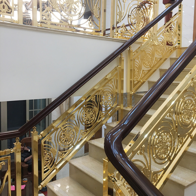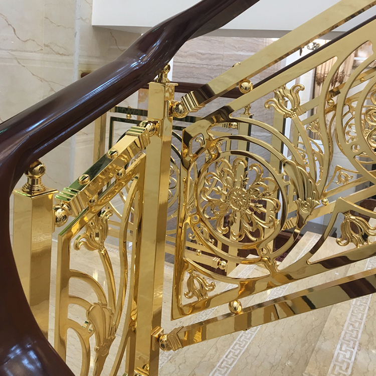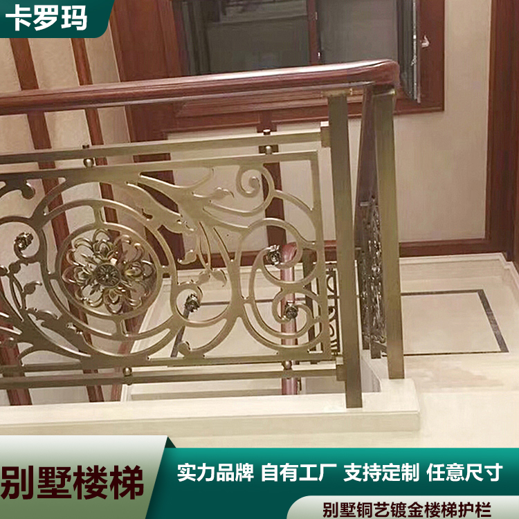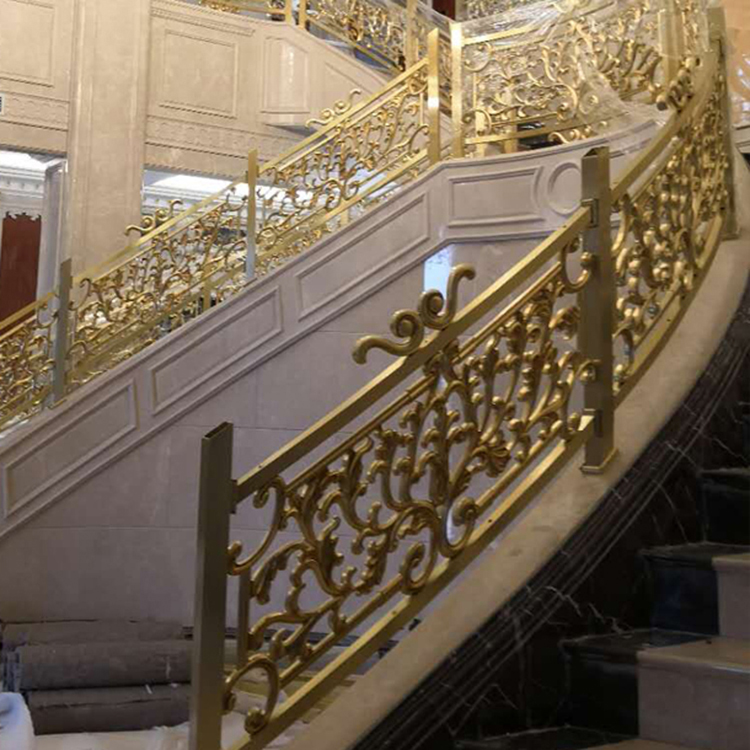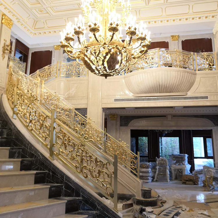 金色别墅铜楼梯扶手的性能特点非常多,突出的就是其外观特色,以别墅铜雕花镀金楼梯扶手为主的建筑,中华古来有之,铜本性温润,耐腐蚀,抗菌抗氧化,不易受损,寿长于木材,较之砖瓦,铜扶手更耐岁,而且色调绚丽,浑厚沉稳中不失风雅,苍古盎然中蕴涵新意。