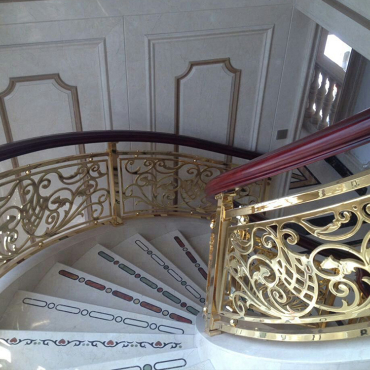 铜雕花楼梯一般都伴有雕花的设计,镂空部分整体的分布非常合理。不仅显出优美,而且还把镂空面积均匀分布,这样在实际的安装使用时候,就会有很稳定的保证,没有大面积的镂空,减少不稳定因素。丰富多样的颜色,对于消费者选择来说,也非常容易,尤其是与环境的风格与颜色进行搭配,就更加方便一些。香槟金、玫瑰金、K金(镀黄金)、钛金、等等,当然在实际的颜色与价格方面,也有一些小的差别,这是因为生产成本决定的。丰富的颜色让造型变化更直接,不同颜色的铜楼梯,有着不一样的美丽,每个消费者欣赏的角度不同,所以也有所差别,选择到称心的那一款,是没有问题的。