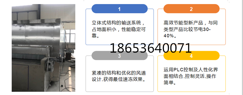 隧道式速冻机特点:高强度不锈钢网带用SUS304不锈钢高强度弹簧钢丝进口设备制作。迎风面积大,因而不易结霜,可长时间连续生产。网带上适用于摆放大小不同的冻品冻结,独特平滑的网面使冻品几乎不留印记。
