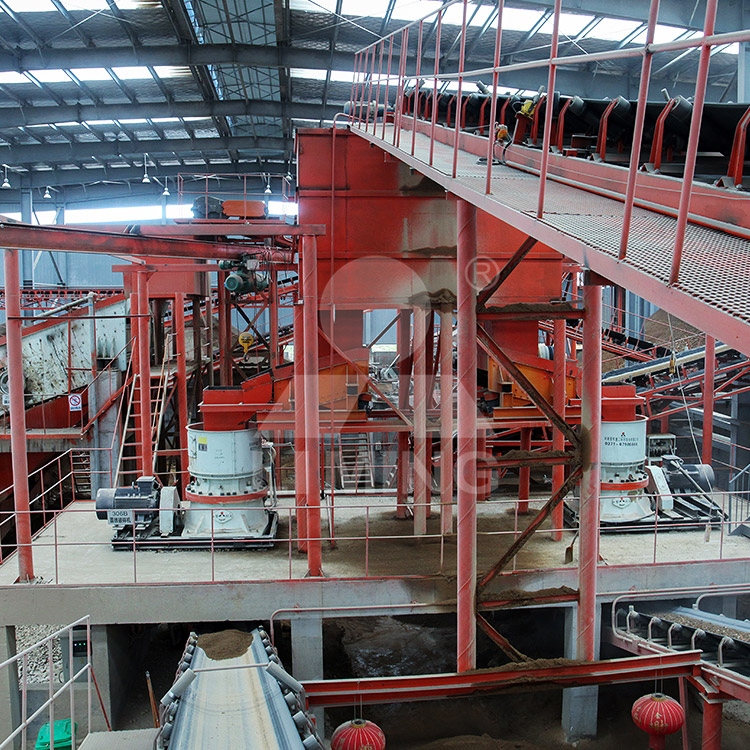 ≤40mm半成品混合料则进入半成品缓冲料仓,通过VSI6X1263立式冲击破进行整形制砂后进入S5X2760-3振动筛筛分分级,成品料最终分别输送至各成品仓储存。另外成品料均进行水洗处理,保证成品料的精品度,同时所产生的污泥水通过细砂回收装置,进入污水处理系统循环再利用。