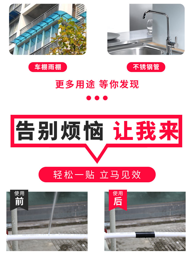 防水胶带产品特征:用于光滑平整面的漏水修补等,粘贴性堵漏修复胶带