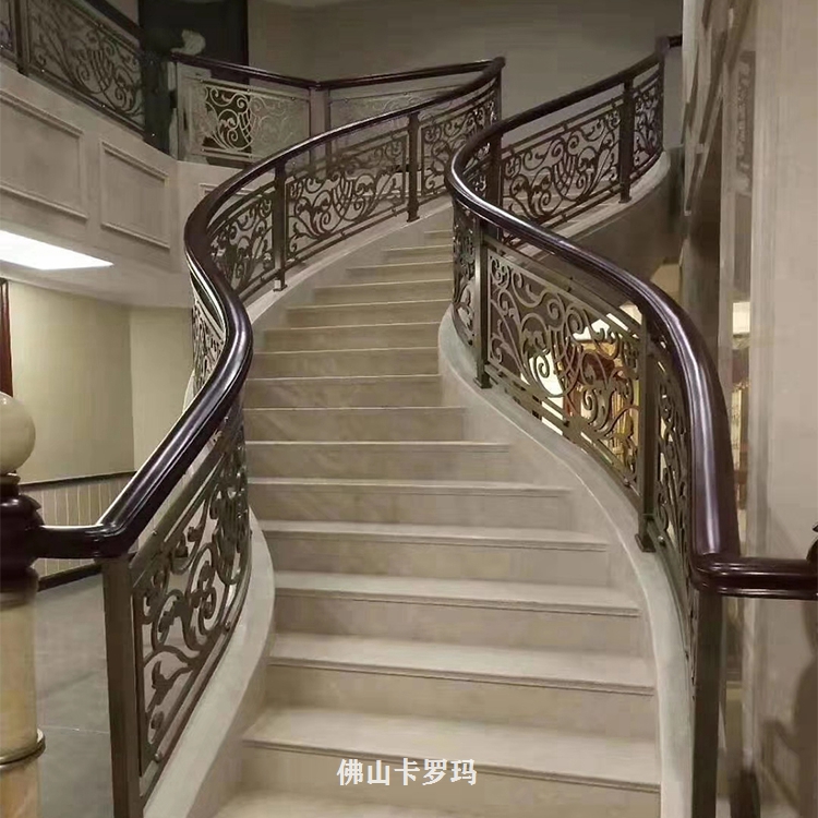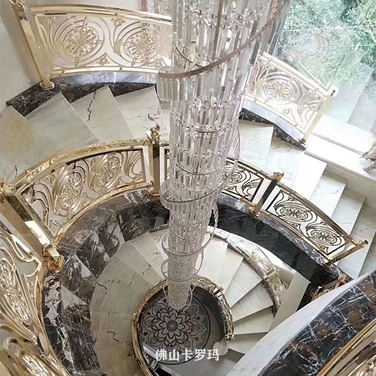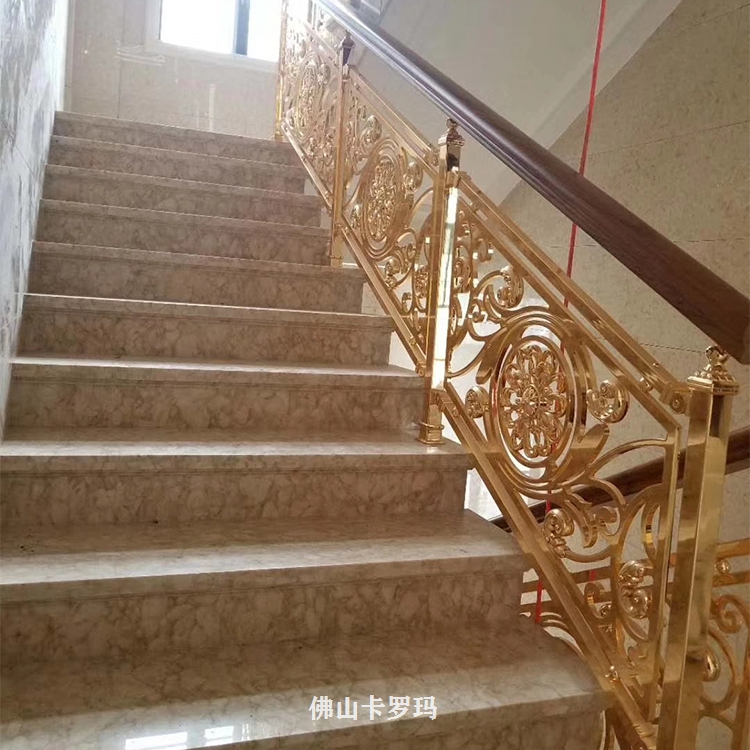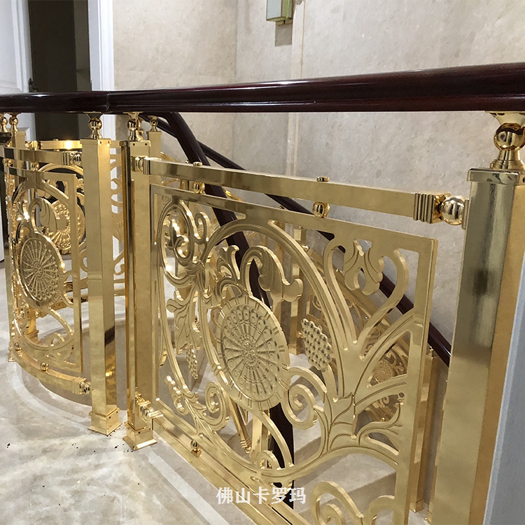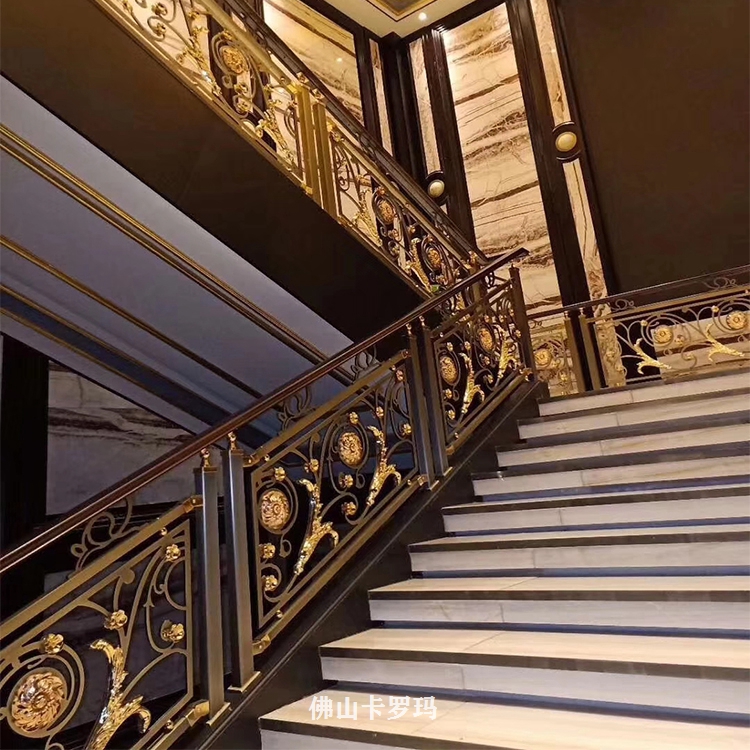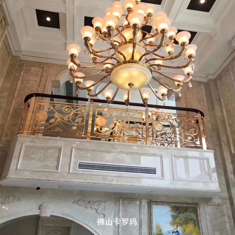 K金铜艺雕花楼梯护栏应用范围:KTV、咖啡厅、宾馆、茶楼、酒店、家庭等室内装饰与。可根据客户要求或提供图纸来订做不同图案、颜色、造型的艺术金色铜浮雕楼梯护栏。外表十分为润滑的粉末涂层可防御紫外光,无需常常修理并可长期保持亮丽光泽,粉末已然经用,又有多种色彩可供挑选。玫瑰应有尽有,雕花护栏铜楼梯,可来图订做,护栏造型、中欧式任选、风格多样化,任你订制。欢迎各界朋友莅临参观、指导和业务洽谈。让我们用铜制品打造一个稳定温馨档次的居所。K金铜艺雕花楼梯护栏安装完工图。