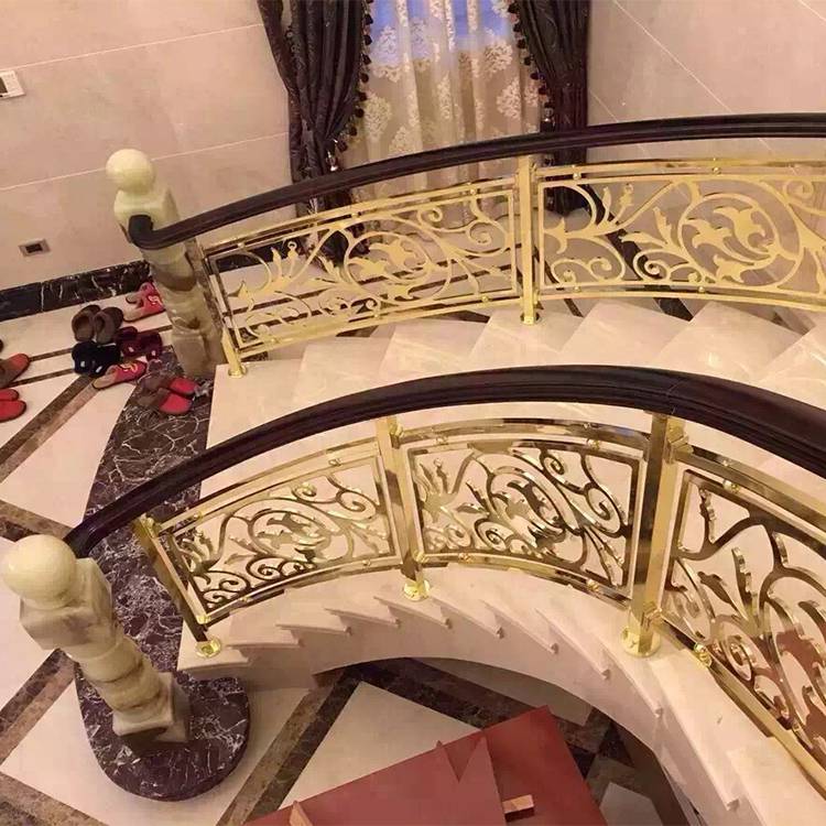 现在越来越多的铜元素加入到居室家装中,其在楼梯的装饰中应用较为广泛,市场上卖的木地板可以拿来直接铺装做踏脚板,铜楼梯扶手也可以选择相应的铜来做。随着楼梯业的不断发展,科技与时代的不断进步发展,生活水平的提高、等档次住宅已逐渐进入来越多的视野,在家居装潢中,原先市场占有率不高的楼梯材料,现在也火了起来。现在虽然楼梯品牌所占的摊位和其他装潢材料相比并不算多,但每家店铺的陈设都很考究,各种材质和价位的楼梯尽可能展示在顾客面前。而铜楼梯仍是市场占有率的一种,消费者喜欢的主要原因是铜本身有温暖感,加之与地板材质和色彩容易搭配,施工相对也较方便。现在在中式金色铜楼梯护栏款式的装修已成为了现代人的又一家居典范,在进行家庭装修时候对铜楼梯的考虑需要注意到材质的抉择,卡罗玛金属制品有限公司欢迎你的到来。其实能够用来装饰楼梯的材料还有很多,如铜、石材、玻璃、绳索、布艺、地毯等。将这些材料恰当组合使用,并与整个居室风格相匹配,一定会有很好的效果。城市楼房的不断增多,楼房中为了牢靠起见,在楼道中都会安装楼梯护栏。楼梯护栏不只是为了保障人不摔倒,同时开发商也会追求楼梯护栏的经济性价比。中式金色铜楼梯护栏款式图片。
