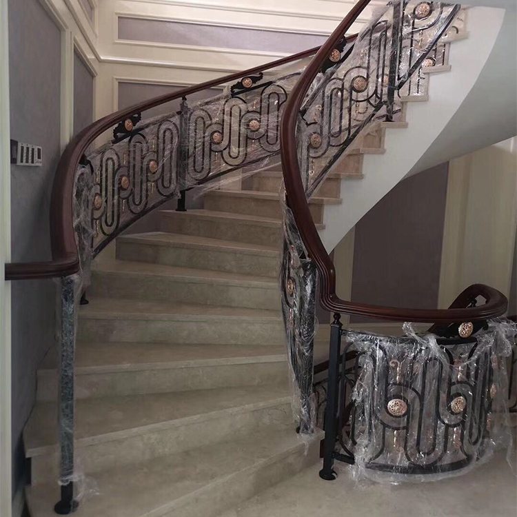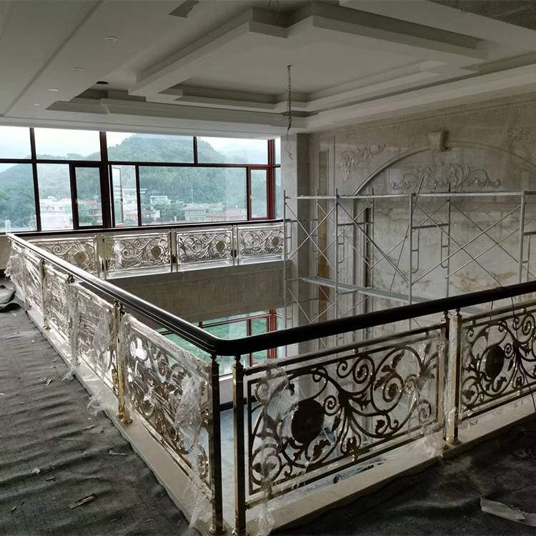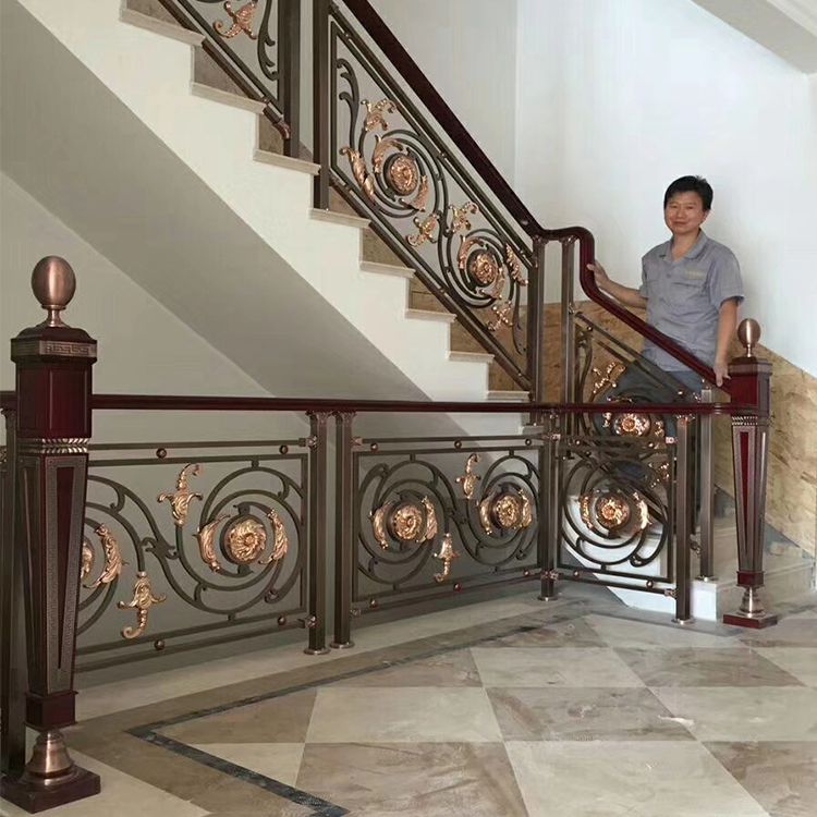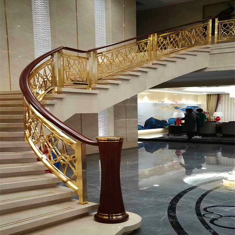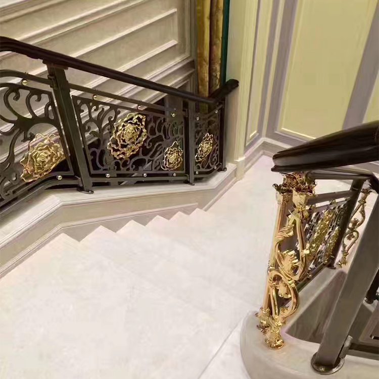 铜自古以来就是尊贵与权位的象征,在中国人的心目中铜是祥瑞神圣之物,人人崇敬备至。金碧辉煌的光泽与厚重的质感使得铜艺装饰、铜楼梯、铜扶手、铜始终深获权贵名士喜爱。铜楼梯在整块实心铜板上雕刻出这种花型本身就是非常的精致而且大方,圆形镂空的雕花,简约而又时尚,加上用金属材质进行雕花,整体的结构设计也特别合理,主体的圆形花瓣,保证了牢靠性,细节处的枝叶搭配,使镂空的部分更加细致,弧形的设计,适应复杂的环境的需要,有着完整而又大气的风格,铜花雕花楼梯护栏风格明显,而且整体感觉非常的大气。金属本身有自然光泽,加上现代高科技着色技术,保持原本的金属质感同时加上品味的设计,香槟金、玫瑰金、K金(镀黄金)、钛金、红古铜、青古铜等多样性的颜色选择,使产品更加丰富。铜楼梯气场强大,实用性强,稳定性能高,使用寿命长。