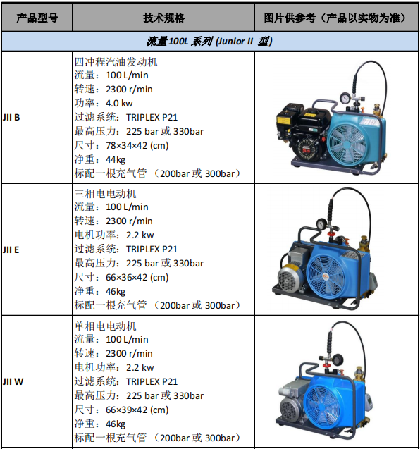 宝华潜水压缩机JUNIRO II 系列是宝华压缩机中排量每分钟100L的机器,这款机器分三相电 ,单相电和汽油机3种。