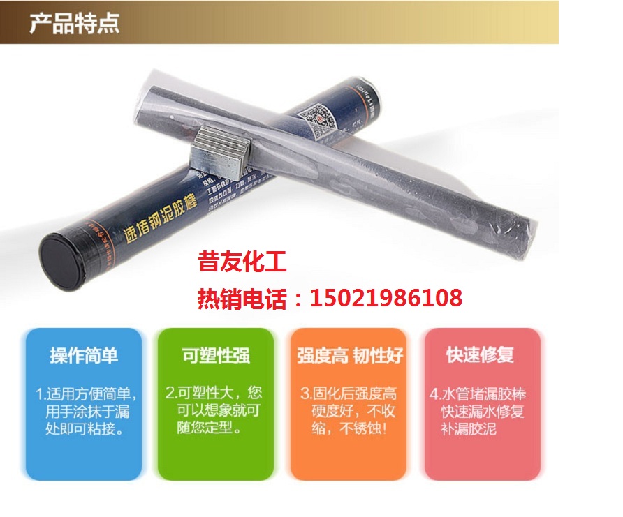 一、形状如橡皮泥、当金属管线和容器罐穿孔泄漏,用此品可以在泄漏时直接塞堵到泄漏孔上,也可以粘接在薄弱部位起到加强作用,堵漏补强佳品。