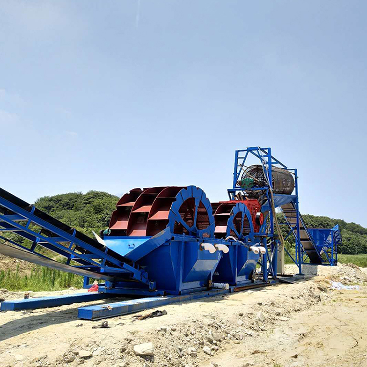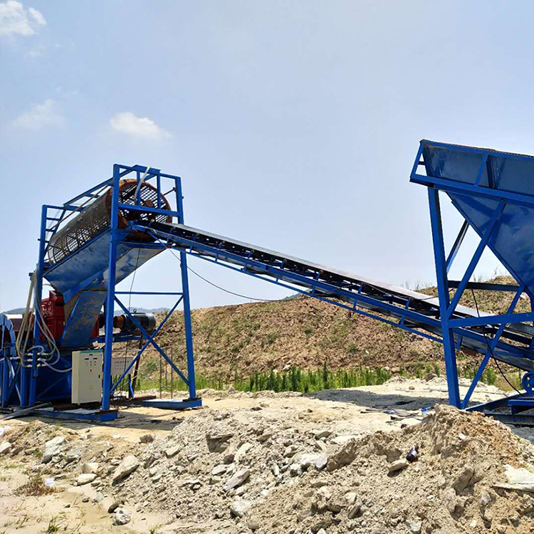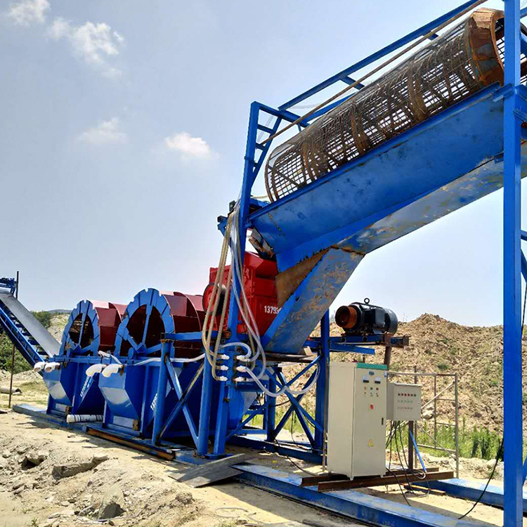 洗砂机工作时,电机通过三角带、减速机、齿轮减速后带动叶轮缓慢转动,砂石由给料槽进入洗槽中,在叶轮的带动下翻滚,并互相研磨,除去覆盖砂石表面的杂质,同时破坏包覆砂粒的水汽层,以利于脱水;同时加水,形成强大水流,及时将杂质及比重小的异物带走,并从溢出口洗槽排出,干净的砂石由叶片带走,然后砂石从旋转的叶轮倒入出料槽,完成清洗作业。